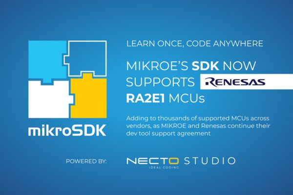 MIKROE, the embedded solutions company that dramatically cuts development time by providing innovative hardware and software products based on proven standards has announced that the latest version of its mikroSDK software development kit now supports the Renesas RA2E1 family of low-power, Arm Cortex-M23 MCUs that operate at up to 48 MHz with up to 128 KB code flash, 16 KB SRAM, and 4 KB data flash. mikroSDK 2.17.12 continues the multi-year MCU development tool support agreement between MIhKROE and Renesas, signed in January 2026,  which commits MIKROE to providing development tools for 500 of Renesas’ most popular MCUs, plus upcoming new releases. Renesas is also establishing, for the first time, a ‘Planet Debug’ remote board farm, which enables developers anywhere in the world to remotely debug code without having to invest in any hardware.