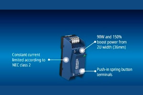 RECOM’s new, cost effective REFIN2U-S90/24/CL DIN-rail AC/DC boasts a 90W rating with a boost capability of 150% for 4.5s to allow for surge loads. Input voltage range is 85-276VAC, rated overvoltage category II (OVC II) up to 5000m altitude, while the output is nominal 24VDC, adjustable to 29VDC. The output has a constant current characteristic in overload and is rated LPS, NEC class 2 according to UL1310. The parts operate from -40°C to +70°C ambient, and a creditable 93.6% efficiency achieved contributes to cool running and long MTBF/lifetime ratings.